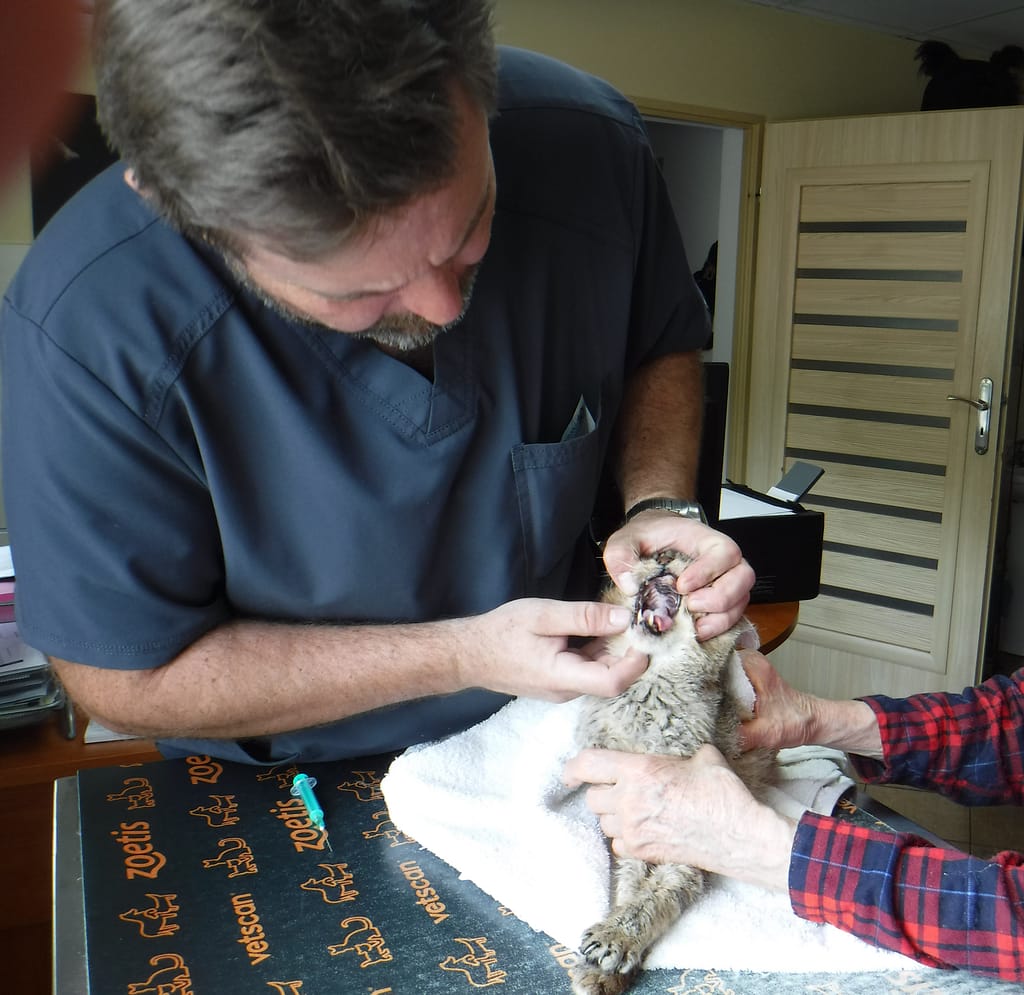 z dziąsłami – silny stan zapalny po lewej stronie pyszczka. Dostała leki, udało się jej pomóc.