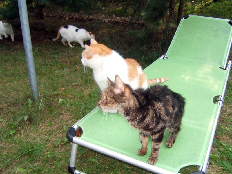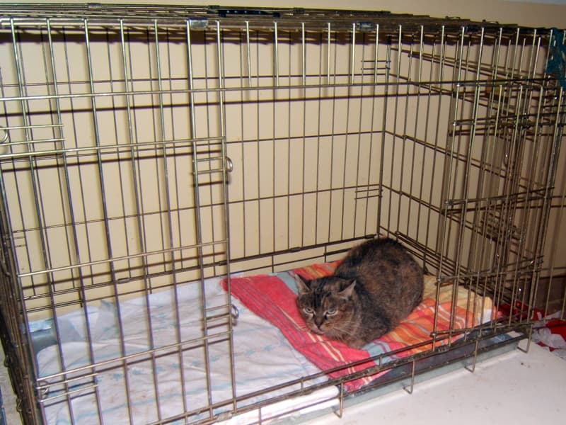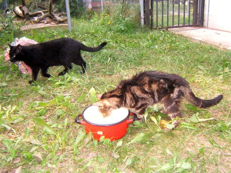 Kłopot z Gabusią był duży. Przez cały rok pokarm podawałam łyżeczką a strzykawką picie. Teraz je sama odpowiednio przygotowany pokarm. Dobrze wygląda, jest szczęśliwa, baraszkuje w klatce, w której od początku siedziała. Lubi to miejsce i prawie z niej nie wychodzi. Śpią tam czasem niektóre koty z Gabusią dla towarzystwa.