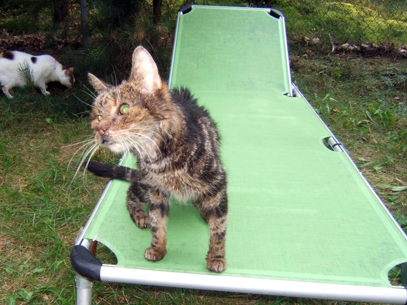 ŁAJZA nasza najstarsza i najukochańsza kotka ma 23 lata. Pisaliśmy o niej kiedy skończyła 20 lat. Była zdrowa i szczęśliwa i wyglądała doskonale. W tym roku schudła i zmieniła się bardzo. W czerwcu tego roku dopadł ją całkowity paraliż. Nie wstawała z legowiska. Zaczęły się ogromne kłopoty. Pojechaliśmy do Kliniki na ul. Janosika po ratunek. Pani dr Kamila Idzikowska podała leki, które do tej pory podajemy. Po kilku dniach nasza staruszka podniosła się o własnych siłach i zaczęła chodzić. Trafia bezbłędnie do kuwety i miseczek z piciem i jedzeniem. Chodzi coraz lepiej z lekko pochyloną głową. NIE CIERPI. Ma apetyt często je i ciągle prosi o pieszczoty na moich kolanach. Chce być blisko nas.