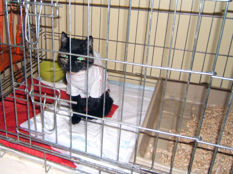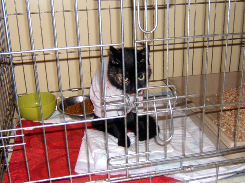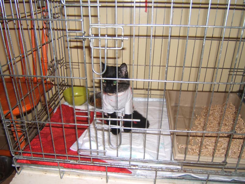 Stworzyliśmy najlepsze warunki, żeby nie uszkodziła znowu opatrunków. W nowej dużej klatce, gdzie mieści się kuweta z piaskiem, miejsce na miseczki z piciem i jedzeniem i jeszcze sporo miejsca na legowisko z poduszeczkami. Golfik z rękawkami specjalnie uszyty chroni od urazu całą łapkę i bark. Teraz jest już na wolności, biega lekko kulejąc z kotami w pokoju i w wolierze na zewnątrz.