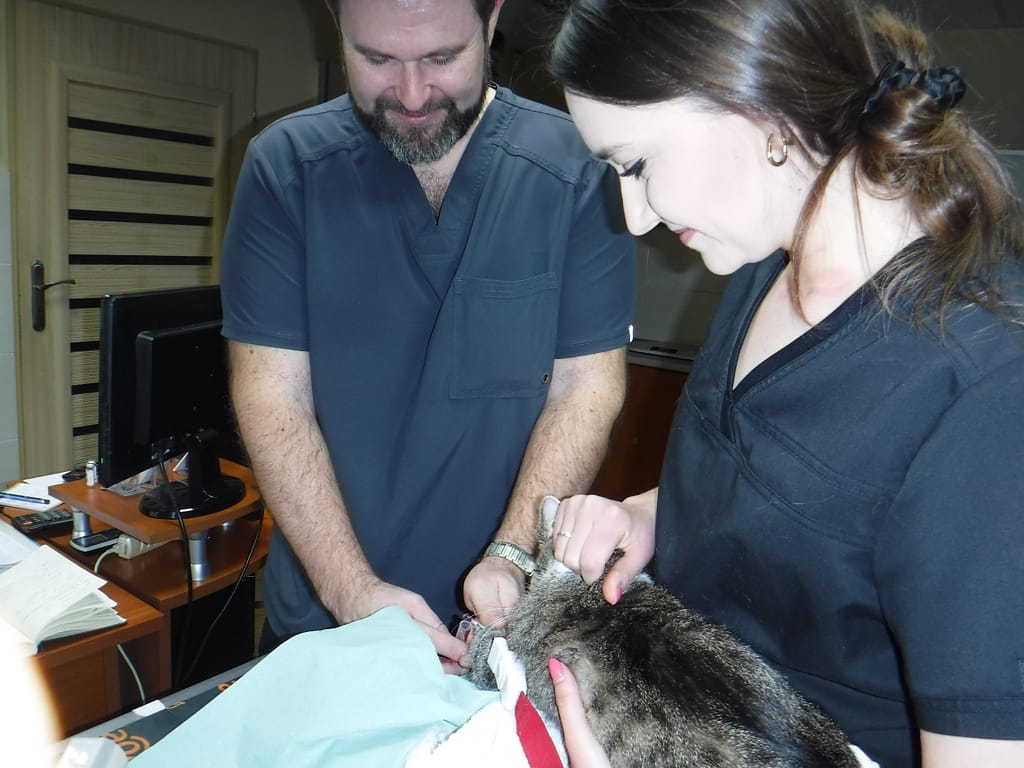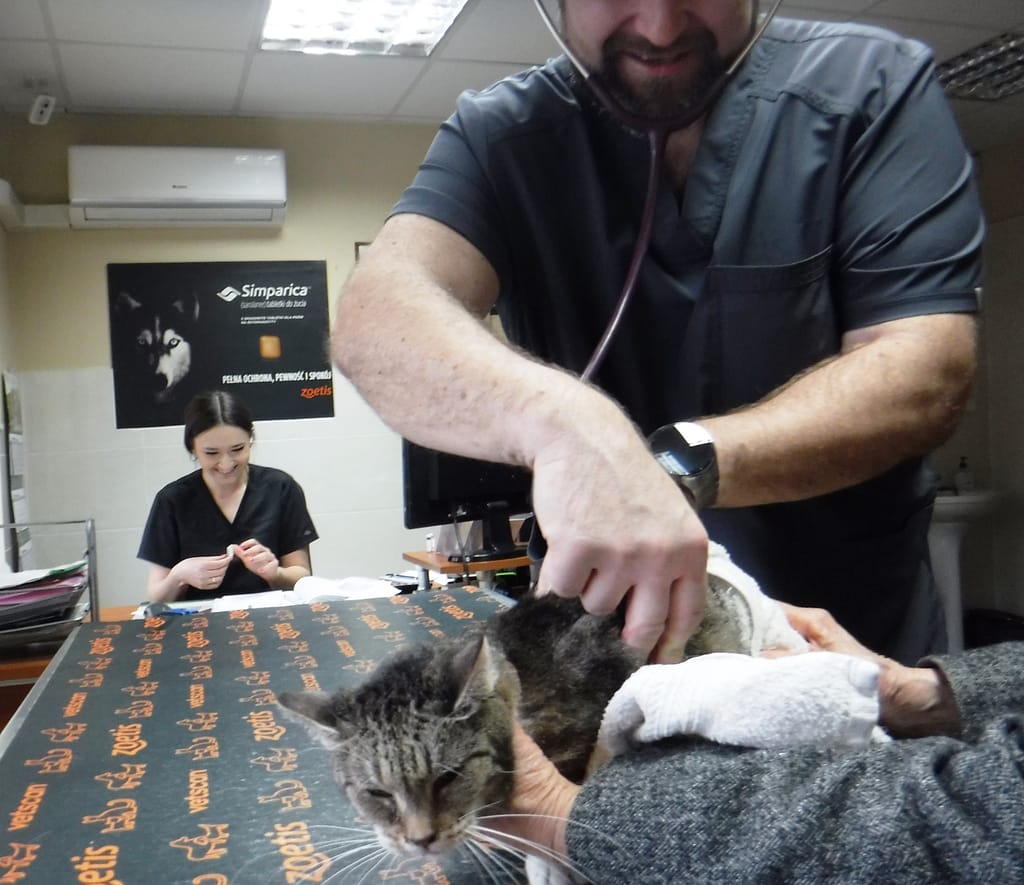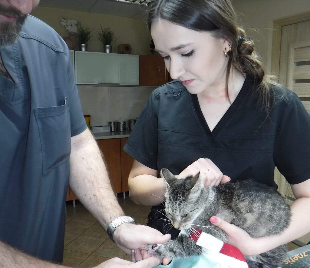 jeździmy z nią do kliniki weterynaryjnej doktora Sadoka w Zgierzu. Kotka dostaje zastrzyk, który bardzo jej pomaga.